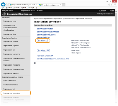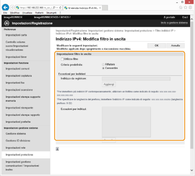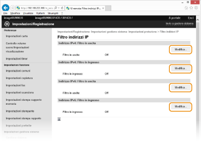 Verificare errori immissione Se gli indirizzi IP sono immessi in modo non corretto, potrebbe non essere possibile accedere alla macchina dalla IU remota, in questo caso è necessario impostare <Filtro indirizzi IPv4> o <Filtro indirizzi IPv6> a <Off>. Filtro indirizzi IPv4 Filtro indirizzi IPv6