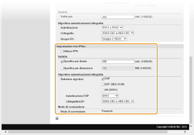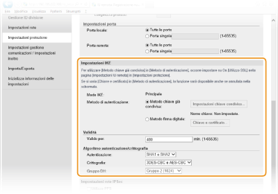 Specificare le impostazioni [Valido per:] e [Autenticazione:]/[Crittografia:]/[Gruppo DH:].