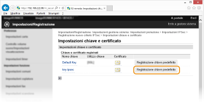 Fare clic su [Registrazione chiave predefinita] a destra della coppia di chiavi che si desidera utilizzare.