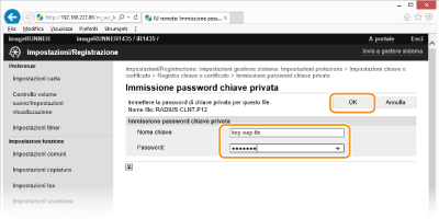 [Password:] Immettere fino a 24 caratteri alfanumerici per la password della chiave privata impostata per il file da registrare.