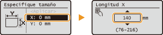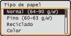 Si la pantalla anterior no aparece cuando hay papel cargadoSi siempre carga el mismo papel en la bandeja multiuso, puede omitir las operaciones de configuración del papel registrando el tamaño y el tipo de papel como opción predeterminada. Sin embargo, si se registra la opción predeterminada, la pantalla anterior no aparecerá. Para visualizar la pantalla, seleccione <Off> para <Guardar opc. prefijada> (Registro de la configuración del papel predeterminada para la bandeja multiuso).