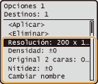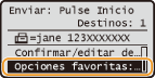 <Opciones favoritas> <Guardar/Eliminar> seleccione la opción edite la opción <Aplicar> <Sí> . No puede cambiar los destinos registrados en la opción con este procedimiento. Registre una nueva opción con los destinos deseados.Si desea eliminar una opción registrada, pulse