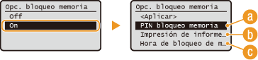 <Opciones de gestión del sistema>    <Opciones de gestión de comunicaciones>    <Opciones de bloqueo de memoria>    <On>    Especifique cada opción    <Aplicar>