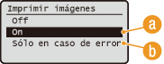 <Opciones de gestión del sistema>    <Guardar/imprimir al reenviar>    <Imprimir imágenes>    Seleccione <On> o <Sólo en caso de error>