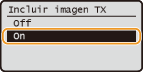 Si selecciona <On> o <Sólo en caso de error>, una parte de un documento de fax puede incluirse en el informe. Establezca <Incluir imagen TX> en <On> y pulse .