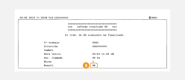 "OK" indica que el fax se recibió correctamente, mientras que "ER" y tres dígitos (código de error) indican que la comunicación de fax no se realizó correctamente (