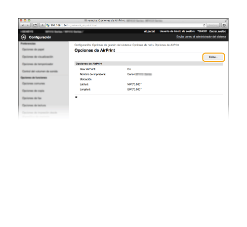 Puede registrar la información, incluido el nombre del equipo y la ubicación de instalación, que se utilice para identificar el equipo. Asimismo, puede deshabilitar la función AirPrint del equipo. Utilice la IU remota para cambiar estas opciones.