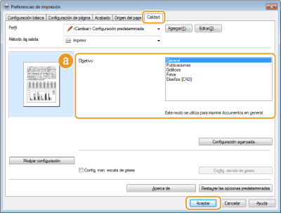 Seleccione una opción que se adapte al tipo de documento o al propósito de la impresión. Por ejemplo, seleccione [General] para el uso general, o seleccione [Fotos] cuando desee imprimir imágenes fotográficas con una calidad de impresión óptima.