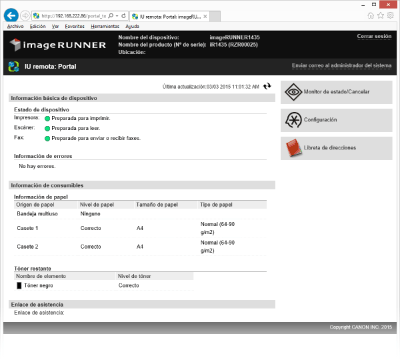 Para utilizar el equipo de forma remota, debe introducir la dirección IP del equipo en un navegador web e iniciar la IU remota. Compruebe la dirección IP establecida en el equipo previamente (