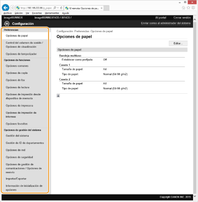 Puede cambiar la configuración en [Opciones de gestión del sistema] solo cuando inicie sesión en el modo Administrador del sistema.