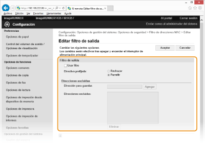 Comprobación de los errores de entrada Si las direcciones MAC se introducen de forma incorrecta, es posible que no pueda acceder al equipo desde la IU remota, en cuyo caso deberá establecer <Filtro de direcciones MAC> en <Off>. Filtro de direcciones MAC