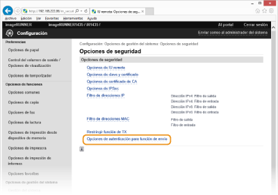 Si se selecciona [Limitar el envío a mí mismo o a la carpeta especificada] en [Envío de archivos:], haga clic en el botón de opción para especificar cómo se autenticarán los usuarios en el servidor de archivos.