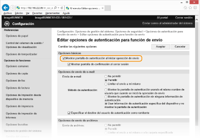 Marque la casilla de verificación [Mostrar pantalla de autenticación al iniciar operación de envío] para habilitar Envío autorizado.