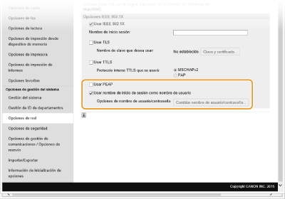 Las opciones necesarias son casi las mismas que las de TTLS. MSCHAPv2 se utiliza como protocolo interno. Habilite TLS para la IU remota antes de configurar este método de autenticación (