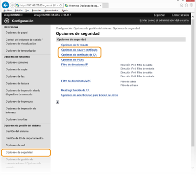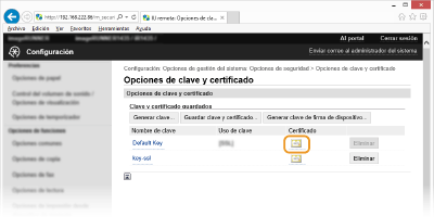 [Opciones de clave y certificado] (para los pares de claves) u [Opciones de certificado de CA] (para los certificados de CA).
