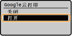 如果要禁用 Google Cloud Print 功能,请选择 <关闭>。