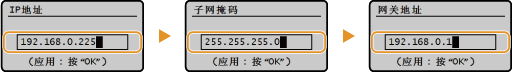 <子网掩码> <网关地址>。在各画面上使用数字键输入设置,然后按
