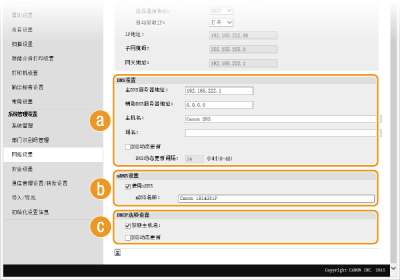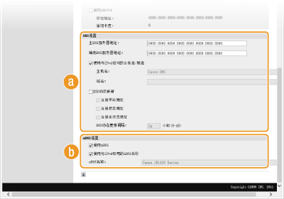 选择该复选框可在本机的 IP 地址更改时动态更新 DNS 记录。指定更新间隔时,请在 [DNS动态更新间隔:] 文本框中以小时为单位输入时间。 [mDNS设置][使用mDNS:]