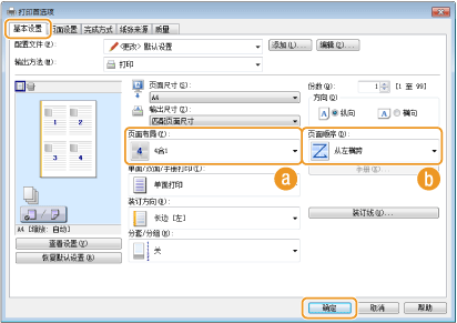 可以将多个页面打印到一页上。例如,通过使用 [4 合 1] 或 [9 合 1],可以将四个或九个页面打印到一页上。如果想节约纸张或者以缩略图形式查看文档,请使用此功能。
