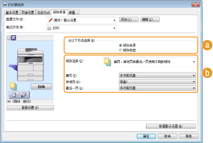 [纸张选择]选择如何指定纸张,例如 [封面和其他页使用不同的纸张]*或 [首页、其他页和最后一页使用不同的纸张]。另外,指定封面和正文页应使用何种纸张。