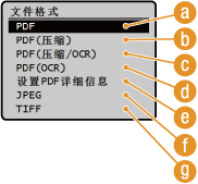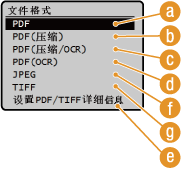 可以从以下六种文档转换文件格式中进行选择:<PDF>、<PDF(压缩)>、<PDF(压缩/OCR)>、<PDF(OCR)>、<JPEG> 和 <TIFF>。扫描的文档被转换为此处指定的文件格式,然后发送到指定接收方。