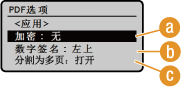 选择以指定使用数字签名生成加密 PDF 的设置。也可以指定通过电子邮件发送多个图像或将多个图像存储到文件服务器时,是否将多个图像分割为独立分开的文件。