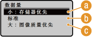 )。<小:存储器优先> 使压缩率高于标准值,从而创建图像质量较低、数据量较小的文件。而 <大:图像质量优先> 则使压缩率低于标准值,从而创建图像质量较高、数据量较大的文件。