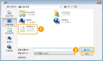 Microsoft Excel과 같은 응용 프로그램에서 작성한 CSV 형식의 주소록 데이터를 기기로 가져오거나 다른 팩스기나 응용 프로그램에서 사용하도록 파일을 내보낼 수 있습니다. 본 기기는 2가지 파일 형식을 지원합니다(CSV 파일(*.csv) 및 Canon 주소록 파일(*.abk)).
