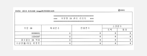 부문별 ID 관리를 활성화한 경우, 리포트를 인쇄하여 복사, 인쇄 및 스캔한 총 페이지 수를 각 부문 ID별로 확인할 수 있습니다. 리포트를 통해 사용량을 모니터링하고 관리를 개선할 수 있습니다.