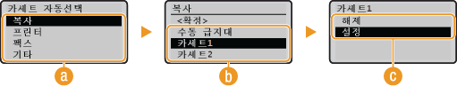 )에서 선택한 용지 공급원에 대해 자동 카세트 선택을 활성화하려면 <설정>을 선택합니다.