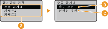 )에서 <프린터>를 선택한 경우 <수동 급지대>가 표시되지 않습니다. 수동 급지대에서 급지되는 용지에 인쇄하는 경우 자동 카세트 선택이 항상 활성화됩니다.
