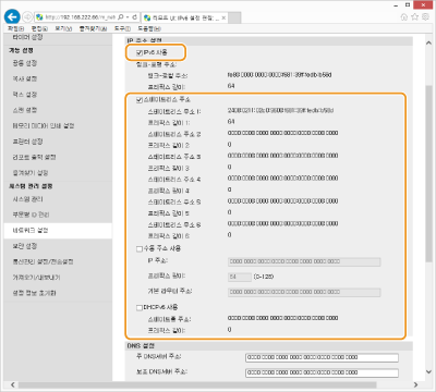 리모트 UI를 통해 기기의 IPv6 주소를 구성할 수 있습니다. IPv6 주소를 설정하기 전에 IPv4 주소 설정을 확인하십시오(IPv4 설정 표시). 스캐너 드라이버를 사용하는 스캔 기능은 IPv6 환경에서 사용할 수 없다는 점에 유의하십시오. IPv6 주소를 사용하려면 정확한 IPv4 설정을 지정해야 합니다. 본 기기는 다음 IPv6 주소 중에서 최대 9개의 주소를 사용할 수 있습니다.