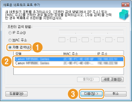 기기가 검색되지 않으면 [새로 고침]을 클릭합니다. 문제가 지속되면 [IP 주소] 또는 [MAC 주소]를 클릭하고 기기의 IP 주소 또는 MAC 주소를 입력한 후 네트워크 설정 표시 [다음]을 클릭합니다.
