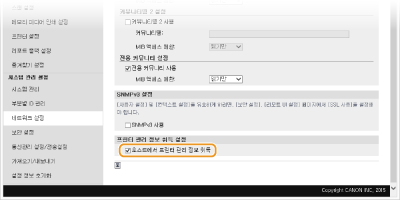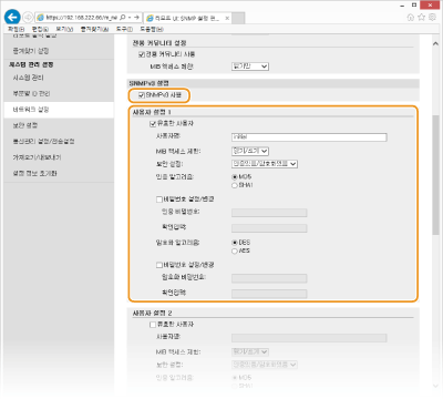 SNMPv1 사용하지 않는 경우두 가지 버전의 SNMP를 모두 비활성화하면 프린터 드라이버를 통한 기기 정보 획득 등 기기의 일부 기능을 사용하지 못하게 됩니다.
