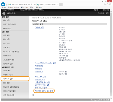 iW Management Console* 등의 장치 관리 소프트웨어를 네트워크에서 구현함으로써 네트워크 장치에 대한 다양한 정보를 효과적으로 수집하고 관리할 수 있습니다. 장치 설정, 주소록 및 에러 로그 등의 정보는 서버 컴퓨터를 통해 검색되고 배포됩니다. 기기가 이러한 네트워크에 연결되어 있으면 장치 관리 소프트웨어가 SLP(Service Location Protocol)와 같은 프로토콜을 사용하여 네트워크에서 기기를 검색하고 기기로부터 정보를 수집합니다. 이 단원에서는 SLP 설정 절차 및 기기와 iW Management Console 플러그인 간의 통신 설정에 대해 설명합니다. 이러한 설정은 리모트 UI를 통해 지정할 수 있습니다.