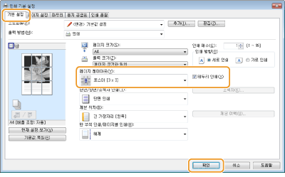 양면 인쇄가 활성화된 경우 포스터 크기 설정을 선택할 수 없습니다. [단면/양면/소책자 인쇄]에서 [단면 인쇄]를 선택한 다음 포스터 크기 설정을 선택하십시오.