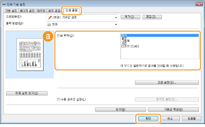 [인쇄 목적]에서 선택한 각 항목에 대해 세부 설정을 지정하려면 [고급 설정]을 클릭하십시오. 자세한 내용을 보려면 프린터 드라이버 화면에서 [도움말]을 클릭하십시오.