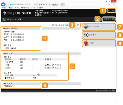 기기의 현재 상태 및 에러 정보를 표시합니다. 에러가 발생하면 [에러 정보] 페이지의 링크가 표시됩니다.