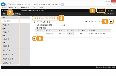 현재 인쇄 문서의 상태와 인쇄, 복사, 송신 기록 및 수신한 문서를 표시합니다.