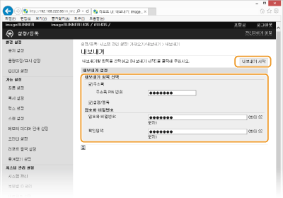 암호화 비밀번호에 대해 최대 32자의 영숫자 문자를 입력합니다. 확인을 위해 [확인입력:] 텍스트 상자에 동일한 비밀번호를 입력합니다. 이 비밀번호는 데이터를 기기로 가져올 때 필요합니다.