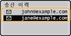 최근에 사용한 세 명의 수신인 중에서 수신인을 선택할 수 있습니다. 이전에 사용한 수신인을 지정하면 기기가 해당 수신인에게 마지막으로 문서를 송신할 때 사용한 설정과 동일한 스캔 설정(예를 들면, 농도)을 다시 사용할 수 있습니다.