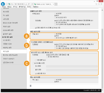 SMTP 인증을 위해 기기의 사용자명과 비밀번호를 사용할 때 선택합니다.이메일이 전송되지 않은 경우에 사용자명과 비밀번호 입력을 위한 인증 화면이 표시되지 않습니다. 이메일로 스캔하도록 기기 구성