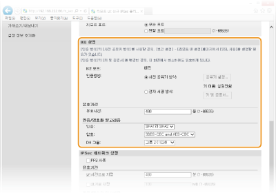 [유효시간:] 및 [인증:]/[암호:]/[DH 그룹:] 설정을 지정합니다.