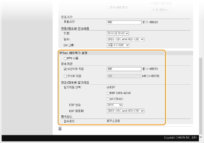 ESP 인증을 활성화하려면 해시 알고리즘에 대해 [SHA1]을 선택합니다. ESP 인증을 비활성화하려면 [사용안함]을 선택합니다.