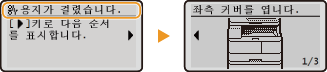 을 눌러 간단한 해결 방법을 화면에 표시합니다. 화면의 절차를 이해하기 어려우면 다음 단원을 참조하여 걸린 용지를 제거하십시오. 걸린 용지를 제거하기 전에 유지 보수 및 점검의 주의 사항을 꼼꼼히 읽으십시오.