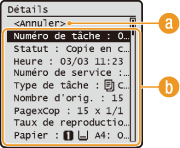 Le nombre de copies, les réglages ainsi que d'autres détails s'affichent. Si vous souhaitez examiner les détails sans annuler la copie, appuyez sur