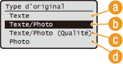 Vous pouvez sélectionner la qualité d'image optimale de la copie selon le type de document (document texte, documents comportant des diagrammes ou des graphiques ou photos de magazine, par exemple).
