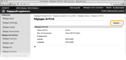 Vous pouvez enregistrer des informations, notamment le nom de l'appareil et le lieu de l'installation, destinées à identifier l'appareil. Il est également possible de désactiver la fonction AirPrint de l'appareil. Servez-vous de l'interface utilisateur distante pour les modifier.