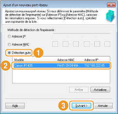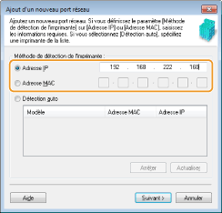 Si l'appareil n'est pas détecté Cliquez sur [Actualiser]. Si le problème persiste, cliquez sur [Adresse IP] ou [Adresse MAC], saisissez l'adresse IP ou MAC de l'appareil Affichage des réglages réseau, puis cliquez sur [Suivant].