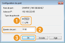 Cliquez la case d'option [LPR] ou [RAW] sous [Type de protocole], modifiez le numéro dans [Numéro de port] si nécessaire, puis cliquez sur [OK].